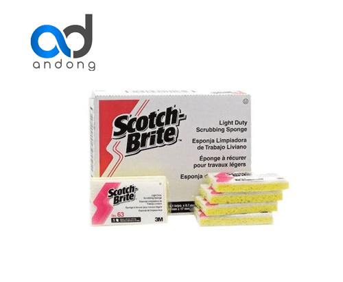 – Miếng Cọ Rửa 3M Scotch Brite 63 làm từ sợi tổng hợp synthetic kết dính với các hạt khoáng nhẹ trên bề mặt sơi.
