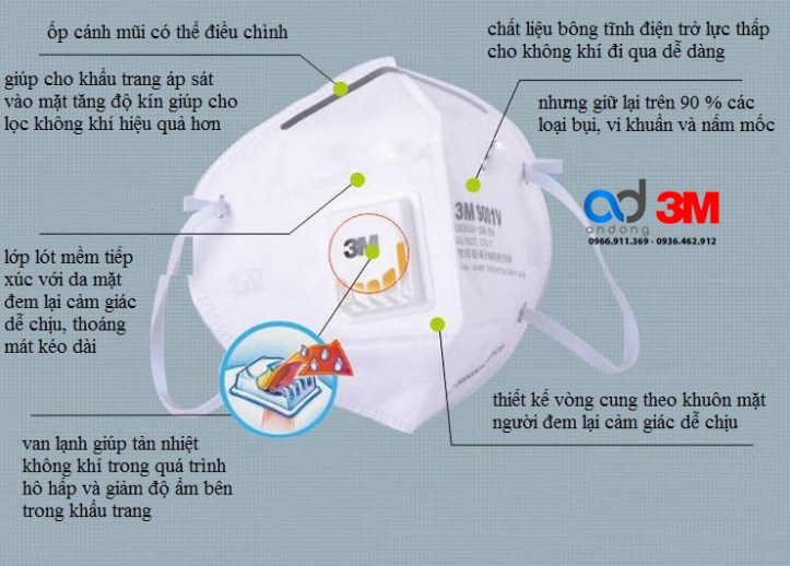 Các lớp của khẩu trang 3M 9001V được làm bằng vải tấm không dệt. Bề mặt trơn nhẵn và mềm mại.